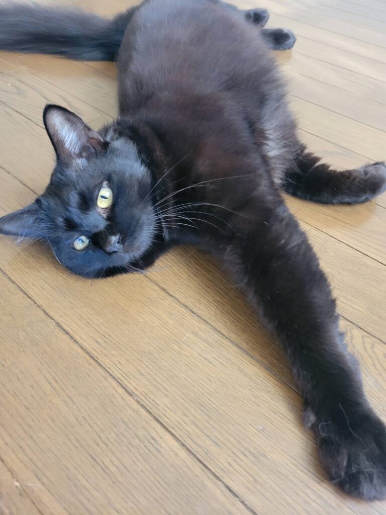 フワフワ長毛の黒猫。人が大好きで構ってもらいたい。