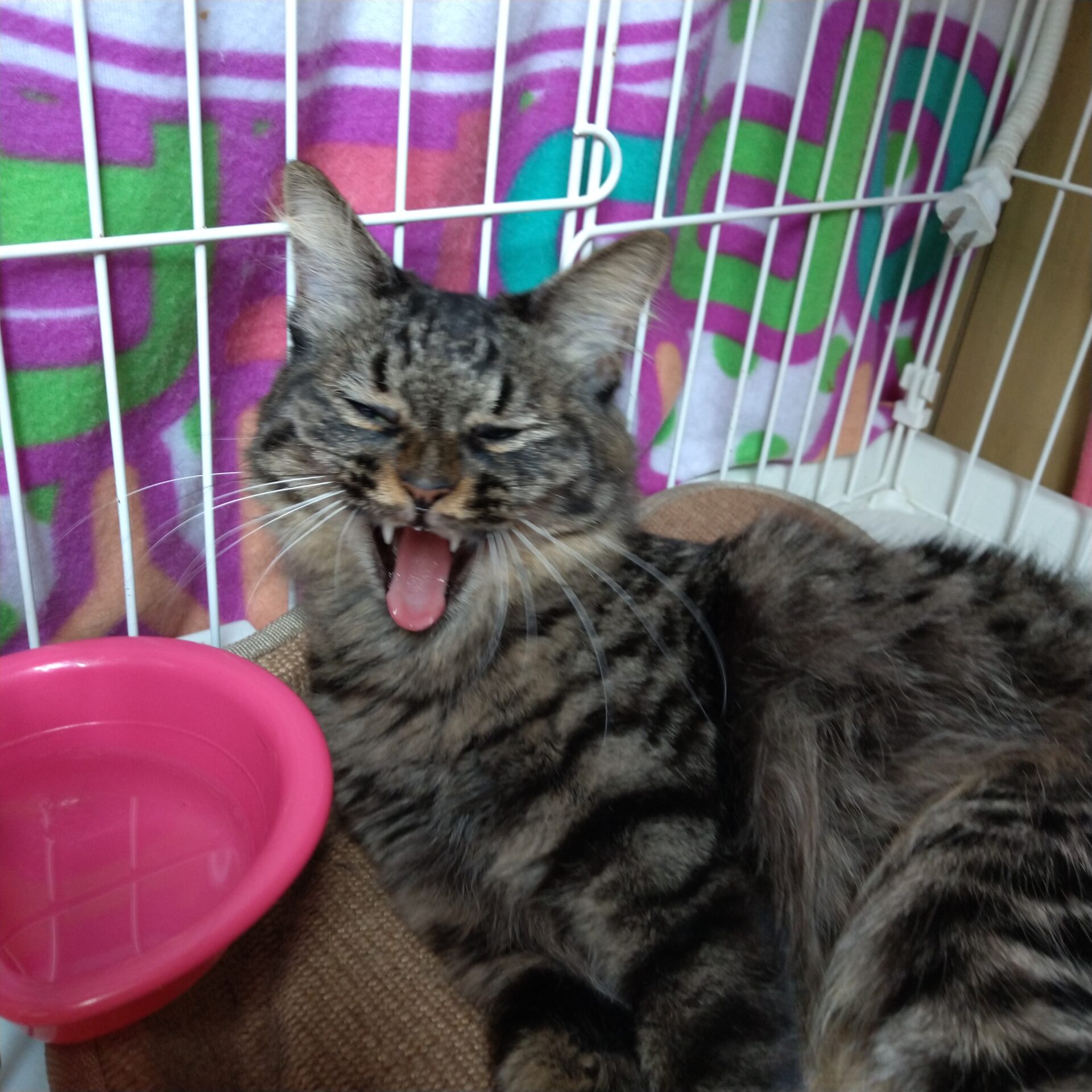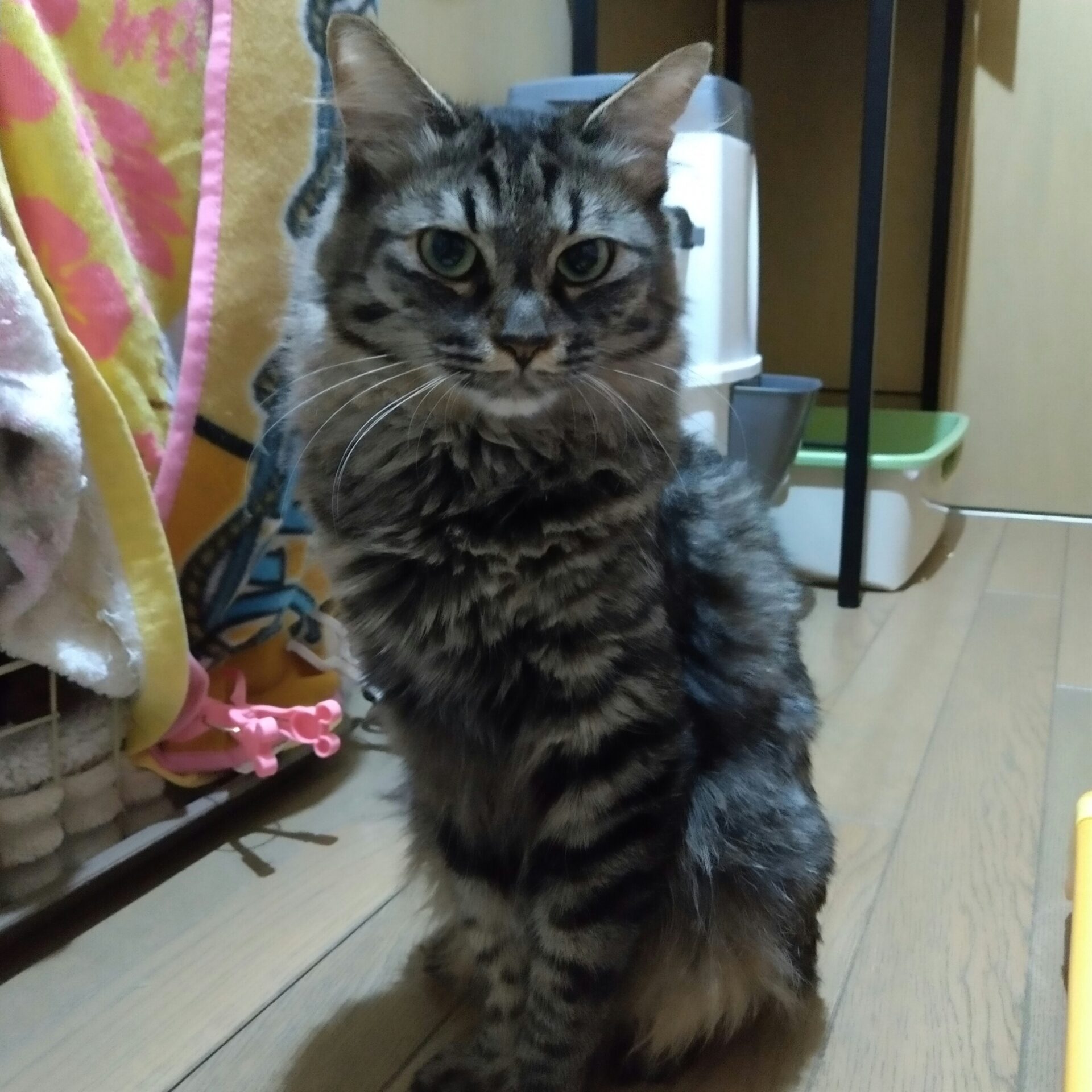 一緒に来たななが出産すると「ワタチの子供!」と世話をしたがりましたが、いざ自分が産むと放任主義でした。一人しか生まれず物足りない!と、ななの子マイキーをひっそり自分の部屋に。(まだ生まれて目の開いてないマイキーがケージから脱走)