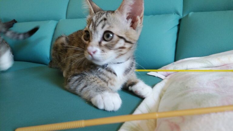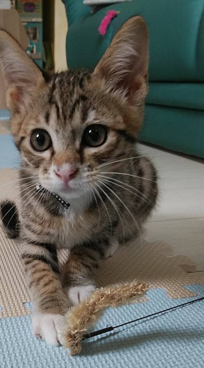 無視していると首元や肩や頭まで上ってスリスリ。猫じゃらしも大好きで よく遊びますが、必ずくわえてどこかに持って行きます。