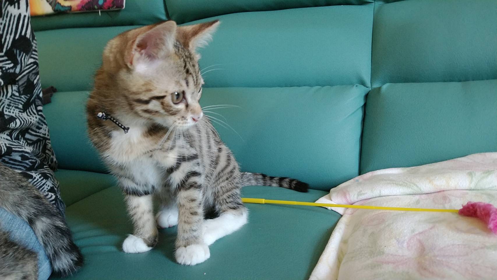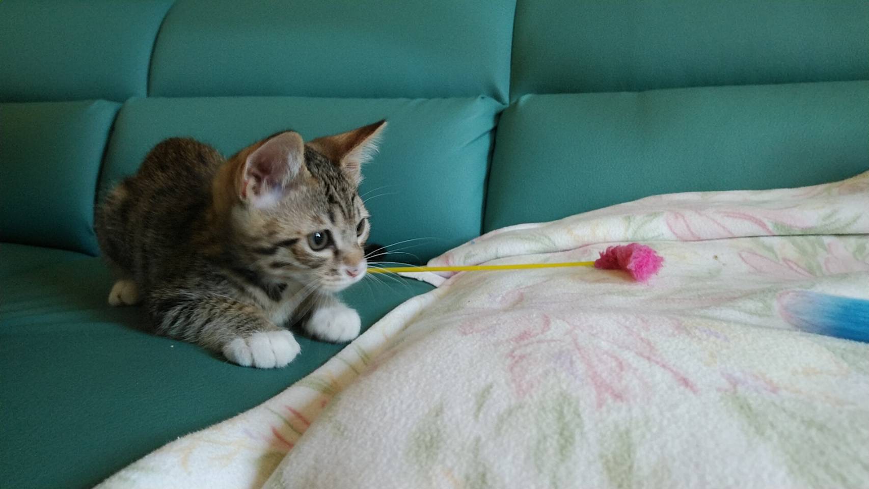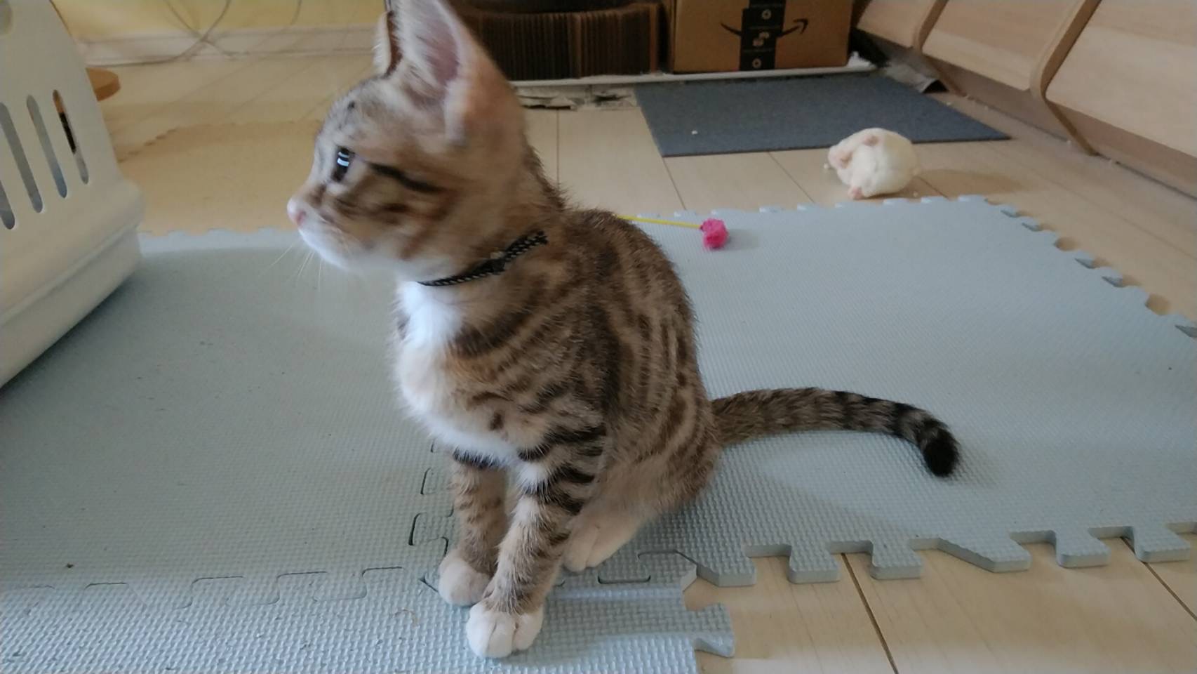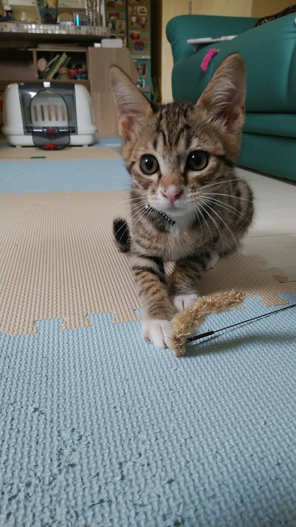 無視していると首元や肩や頭まで上ってスリスリ。猫じゃらしも大好きで よく遊びますが、必ずくわえてどこかに持って行きます。